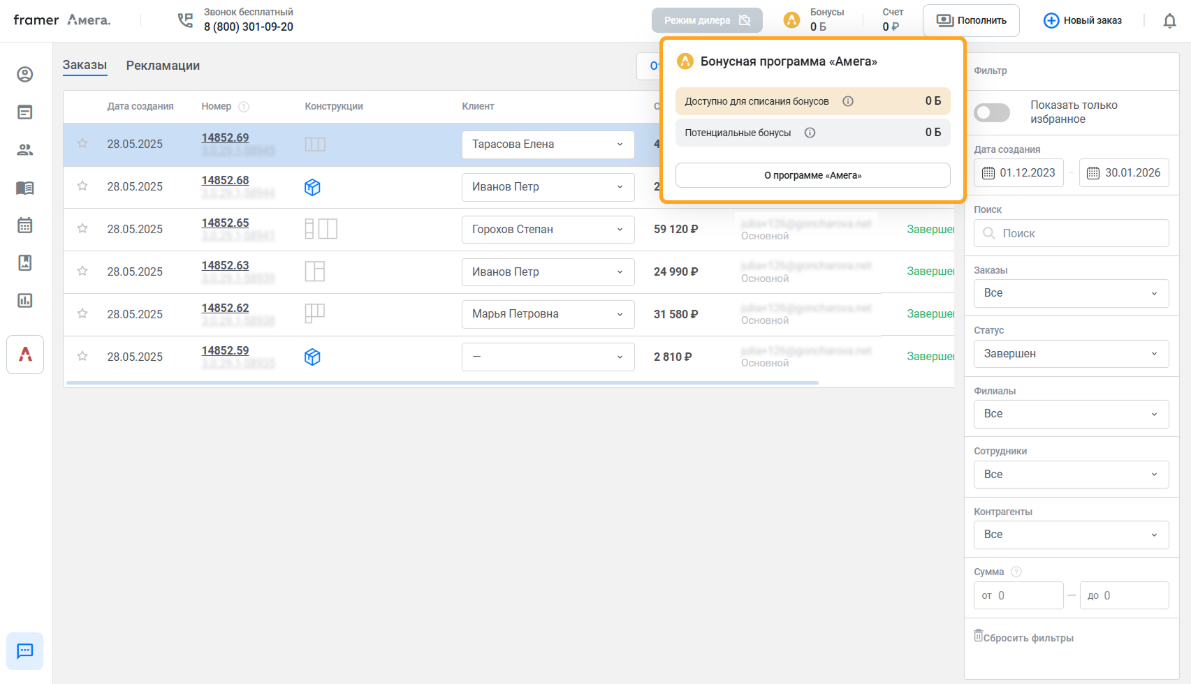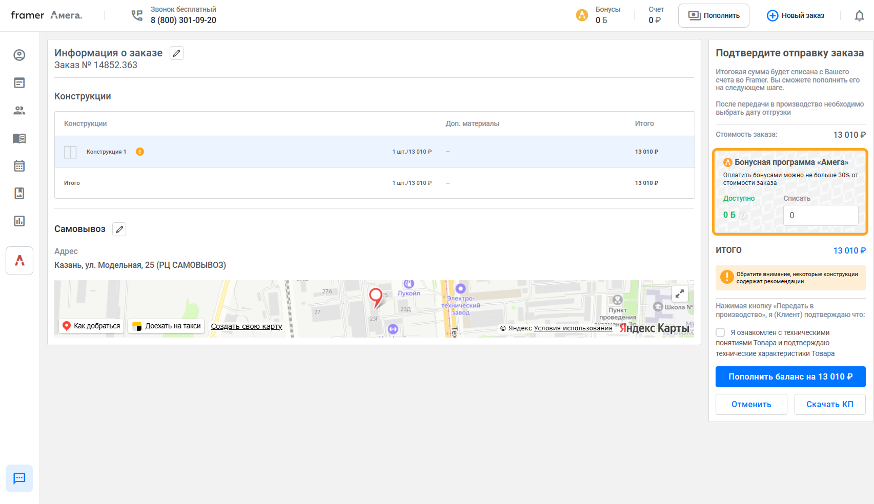 При передаче заказа в производство будет доступно списание бонусов на заказ (до 30% стоимости конструкций / доп. материалов, в соответствии с правилами бонусной программы).